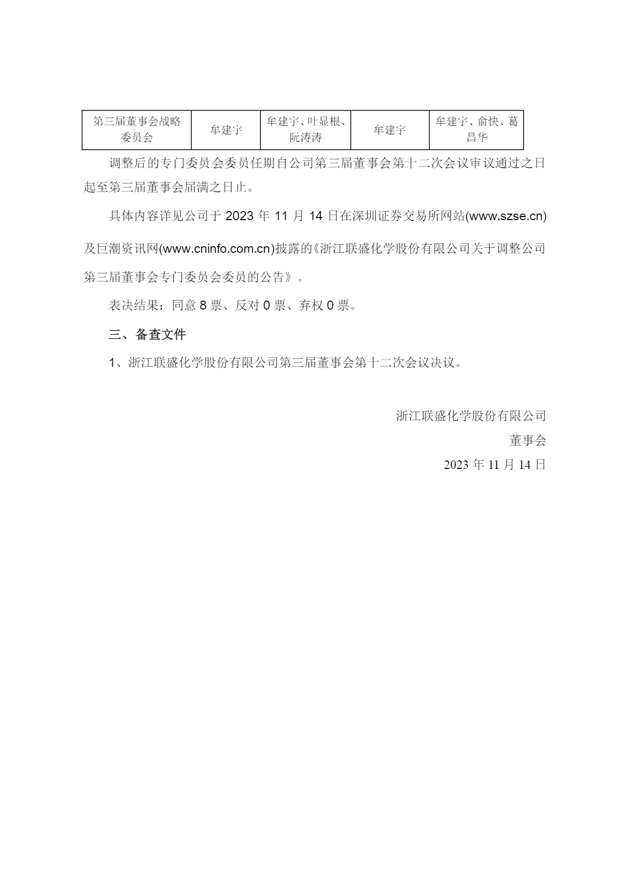 浙江聯(lián)盛化學(xué)股份有限公司第三屆董事會第十二次會議決議公告